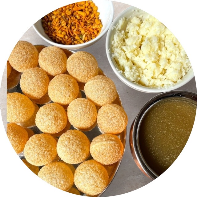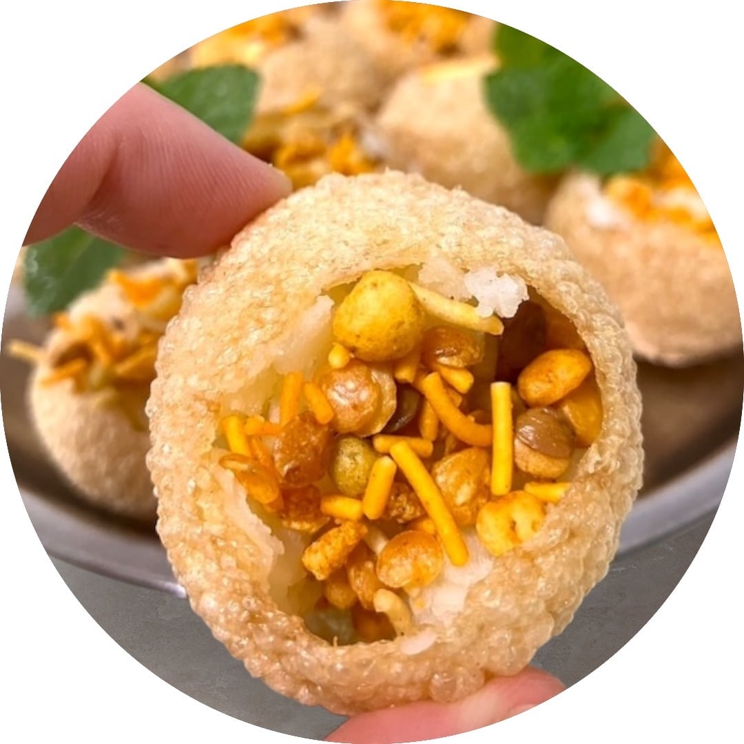 パニプリは、油で揚げたプリ(皮)に穴を開け、ゆでてつぶしたジャガイモや、生玉ねぎ、ゆでたお豆、インドのスナック菓子(ブジヤ)などお好みの具材を詰め、スパイスたっぷりの水(パニ)をジャバッとかけて食べるスパイシーで酸味もある、インドの屋台の味です。